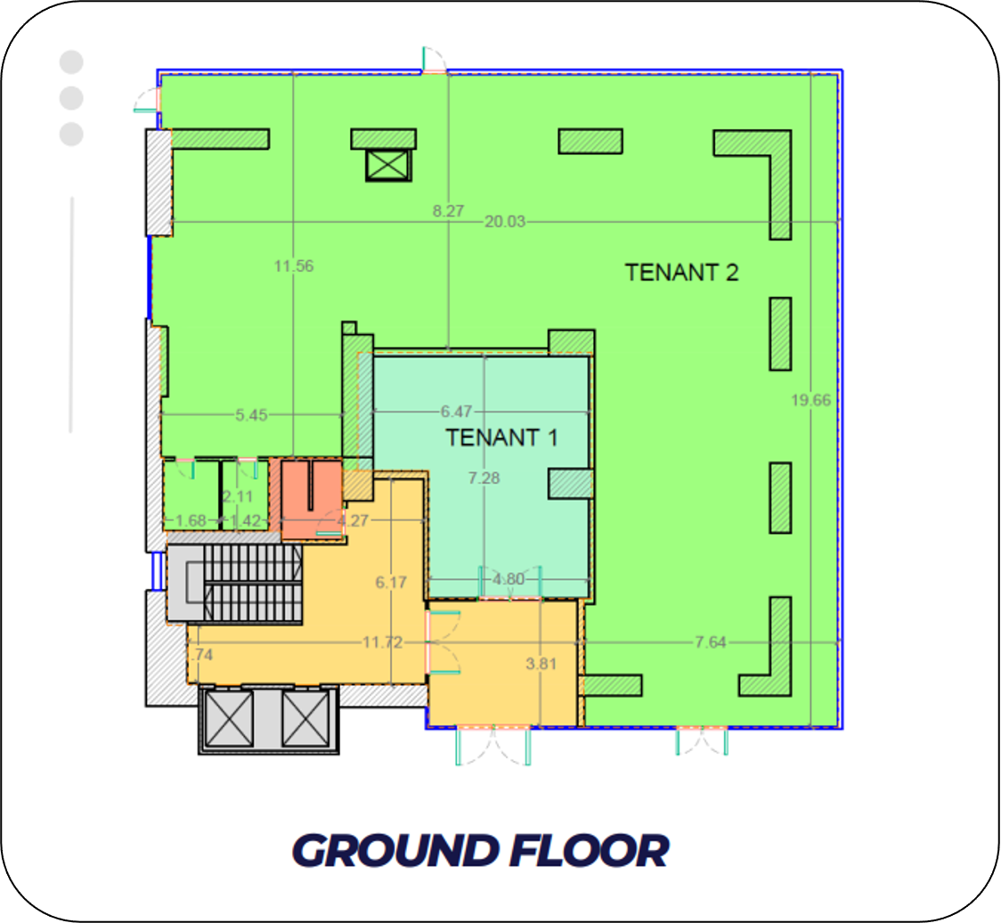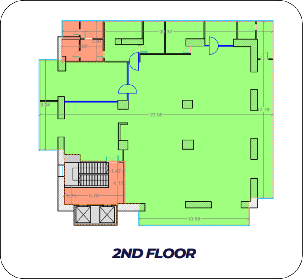 The EKA Business Center is a modern office building with a total leasable area of approximately 2.943 square meters, spread across 7 levels.The building boasts a contemporary design, featuring a glass curtain wall facade that allows for an optimal level of natural light to flood the office space. Vertical access is facilitated by 2 panoramic elevators or by using the stairs.