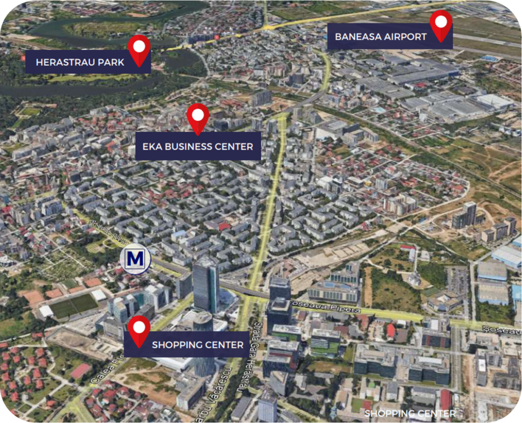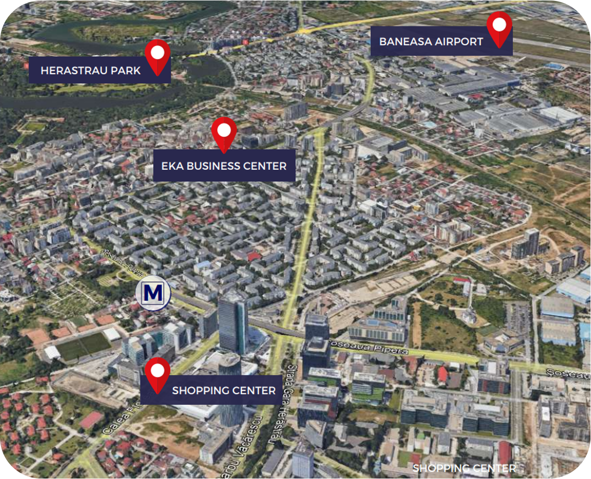 Located on Nicolae Caramfil Street, in the most exquisite business area of the city and in close proximity to the French Village, EKA Business Center grants easy access to its tenants and visitors.The public transport offers links to the building via tram, bus and subway.The area is rich in restaurants, coffee shops, wellness centers, shops and many more.